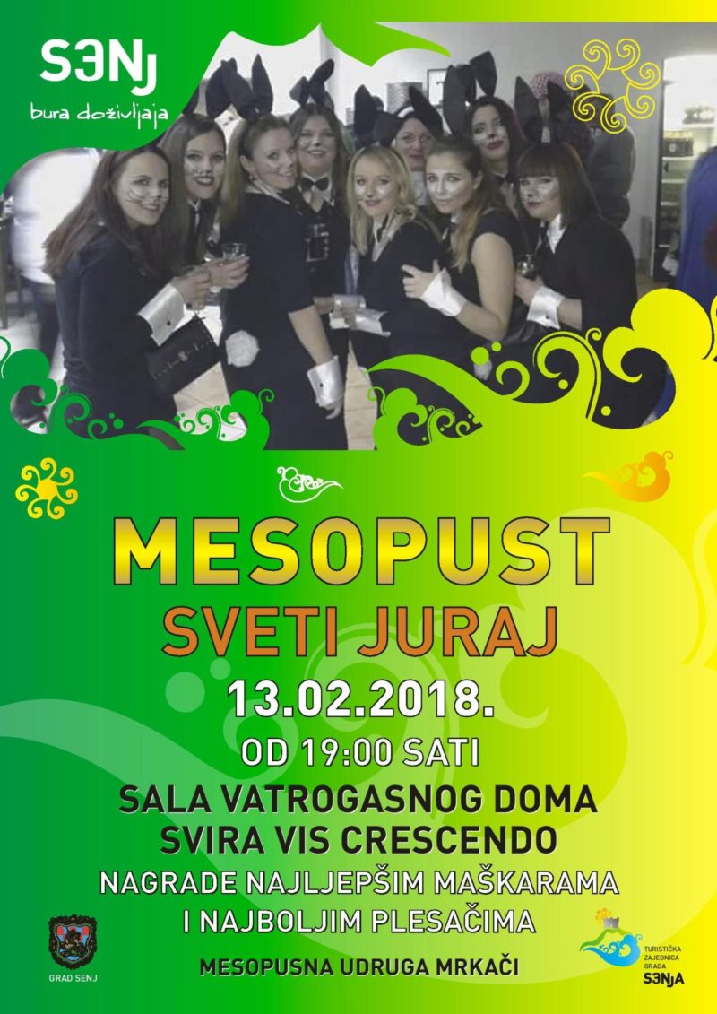 Grad Senj, Turistička zajednica Grada Senja i Mesopusna udruga Mrkači pozivaju Vas u utorak, 13. veljače 2018. g. na Mesopust u Svetom Jurju. Članovi Mesopusne udruge Mrkači tradicionalno će uz muziku i pošalice od ranog jutra obilaziti kućanstva u Svetom Jurju, a završnica svetojurskog šušura započinje od 19:00 sati u sali Vatrogasnog doma gdje će se Mesopustu suditi za sve loše što se dogodilo u protekloj godini. Za dobru glazbenu atmosferu pobrinut će se VIS Crescendo. Najbolje maske i plesači bit će nagrađeni, a jelo i piće za sve posjetitelje bit će besplatno. Svi ste pozvani da se maškarate i zajedno s nama zabavite na svetojurskom Mesopustu!