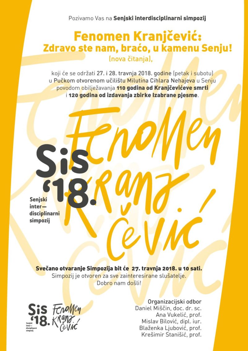 U Senju će se pod pokroviteljstvom Grada Senja 27. i 28. travnja održati prvi Senjski interdisciplinarni simpozij – Fenomen Kranjčević: Zdravo ste nam, braćo, u kamenu Senju! (nova čitanja).