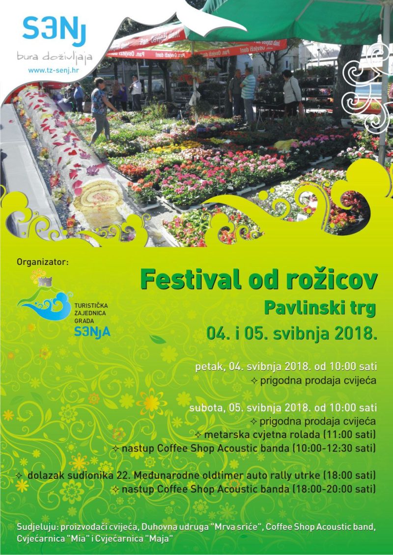 Turistička zajednica Grada Senja organizira 04. i 05. svibnja 2018.g. manifestaciju pod nazivom Festival od rožicov. Festival će se održati na Pavlinskom trgu u Senju, a u sklopu festivala predstavit će se proizvođači cvijeća koji u svojoj ponudi nude razne vrste cvijeća, sadnica, sezonskog bilja i vrtnog programa. Svi zainteresirani ujedno će moći saznati brojne korisne savjete o uzgoju i njezi biljaka te uređenju vrta. Festival će biti otvoren od 10:00 do 20:00 sati. U subotu prijepodne u 11:00 sati na Pavlinskom trgu posjetitelji će moći degustirati veliku metarsku cvjetnu roladu koju će pripremiti Duhovna udruga Mrva sriće iz Senja. Oko 18:00 sati ugostit ćemo sudionike 22. Međunarodne oldtimer auto rally utrke koji će posjetiti tvrđavu Nehaj, a potom na Pavlinskom trgu dodijeliti nagrade i priznanja sudionicima utrke. Automobile ćete moći razgledati na parkiralištu Điga u vremenu od 18:00 do 20:00 sati. Za glazbeni dio subotnjeg programa pobrinut će se Coffee Shop Acoustic band.