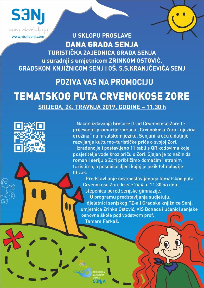Turistička zajednica grada Senja, Gradska knjižnica Senj i Osnovna škola Silvija Strahimira Kranjčevića pozivaju Vas dana 24. travnja 2019. g. na promociju tematskog puta Crvenokose Zore.