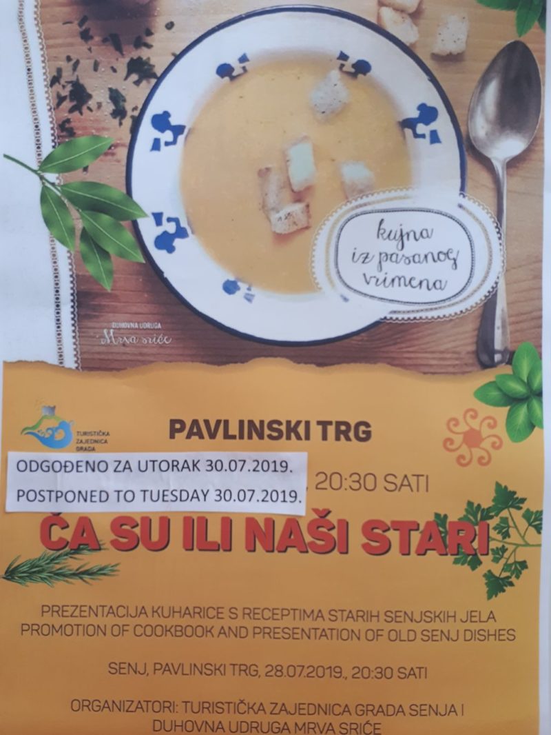 Ovim putem Vas obavještavamo da zbog najave lošeg vremena za nedjelju 28. srpnja 2019.g. odgađamo manifestaciju “Ča su ili naši stari”. Ista će se održati u utorak, 30. srpnja 2019.g. s početkom u 20:30 na Pavlinskom trgu u Senju. Pozivamo Vas da nam se pridružite!