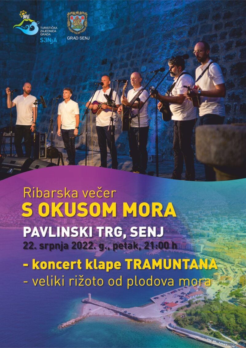 Turistička zajednica Grada Senja i Grad Senj pozivaju Vas dana 22. srpnja 2022.g. na ribarsku večer “S okusom mora” koja će se održati na Pavlinskom trgu u Senju s početkom u 21:00 sat.