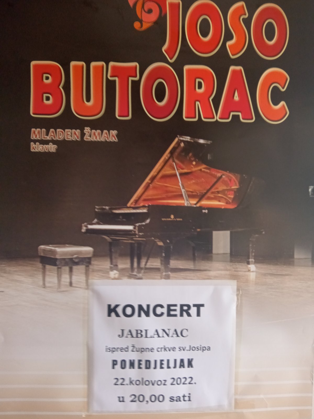 U organizaciji Pučkog otvorenog učilišta M. C. Nehajeva u ponedjeljak, 22. kolovoza 2022.g., ispred Župne crkve svetog Josipa u Jablancu posjetitelje će svojim raznolikim pjevačkim opusom počastiti popularni belkanto pjevač, višestruko nagrađivani autor i pobjednik MIK-a, Joso Butorac. Na glasoviru će ga pratiti Mladen Žmak, a glazbeno druženje započet će u 20:00 sati.