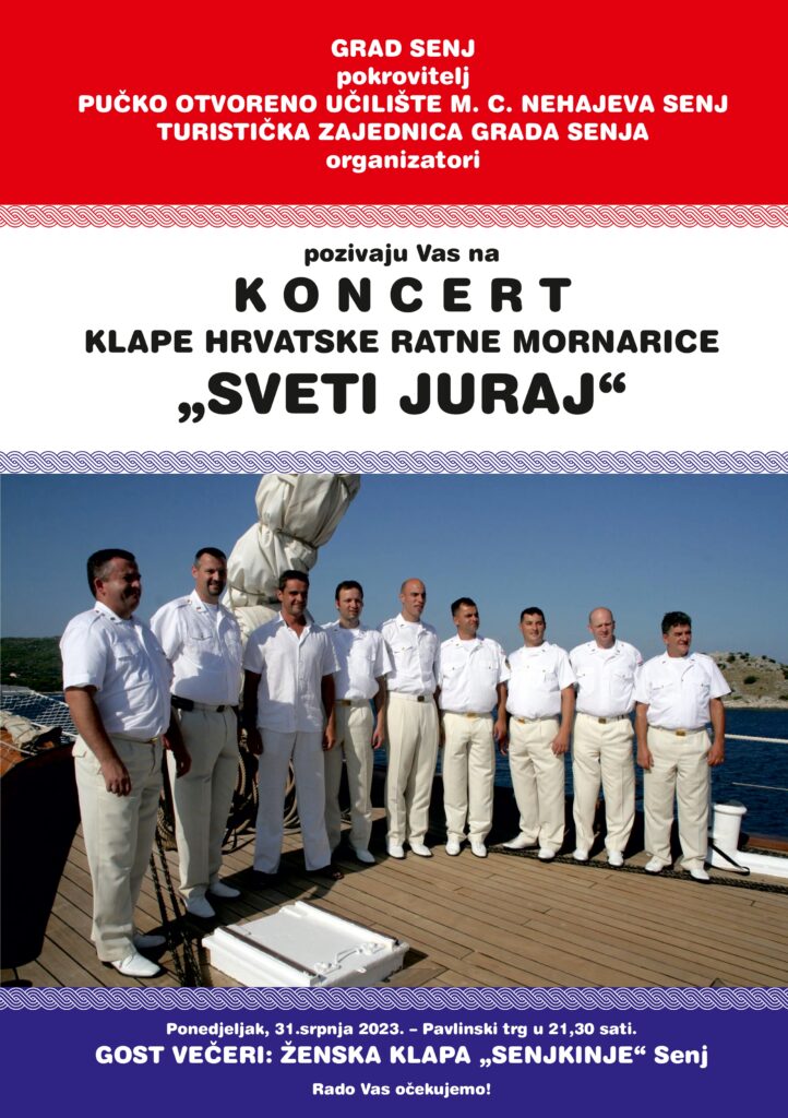 Grad Senj, Turistička zajednica Grada Senja i POU M.C. Nehajeva Senj pozivaju Vas na koncert klape HRM “Sveti Juraj”. Koncert će održati 31. srpnja 2023.g. na Pavlinskom trgu u Senju s početkom u 21:30, a kao gošće večeri nastupit će ženska klapa “Senjkinje” iz Senja. U slučaju iznimno lošeg vremena koncert će se održati u Katedrali Uznesenja Blažene Djevice Marije.