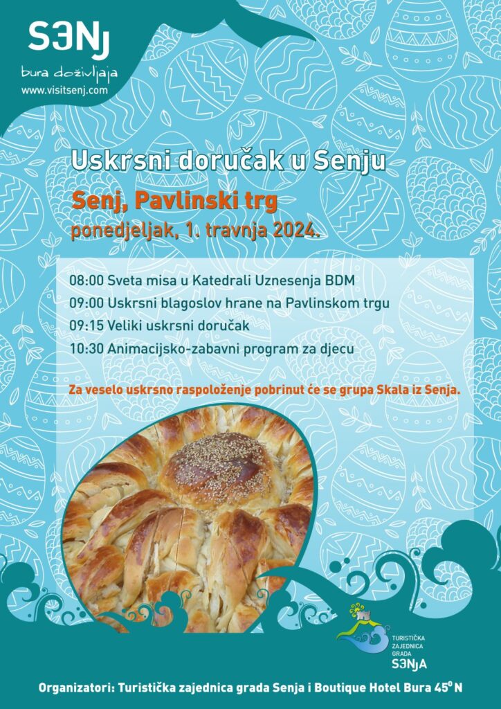 Turistička zajednica grada Senja i Boutique hotel Bura 45ºN organiziraju Uskrsni doručak u Senju kako bi sa svojim sugrađanima i prvim ovogodišnjim gostima proslavili najveći kršćanski blagdan. Uskrsni stol s ponudom tradicionalnih senjskih uskrsnih jela bit će postavljen na Pavlinskom trgu u Senju na Uskrsni ponedjeljak, 1. travnja 2024. od 9:00 sati. Nakon blagoslova hrane svi posjetitelji moći će kušati jela s blagdanskog stola dok će naši najmlađi moći uživati u animacijsko zabavnom programu.