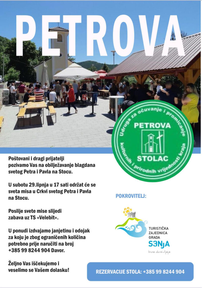 Udruga za očuvanje i promicanje kulturnih i prirodnih vrijednosti kraja “Petrova Stolac” poziva Vas dana 29. lipnja 2024.g na obilježavanje blagdana Svetog Petra i Pavla na Stolcu. U 17:00 sati održat će se sveta misa u Crkvi svetog Petra i Pavla nakon koje slijedi zabava uz TS “Velebit”.