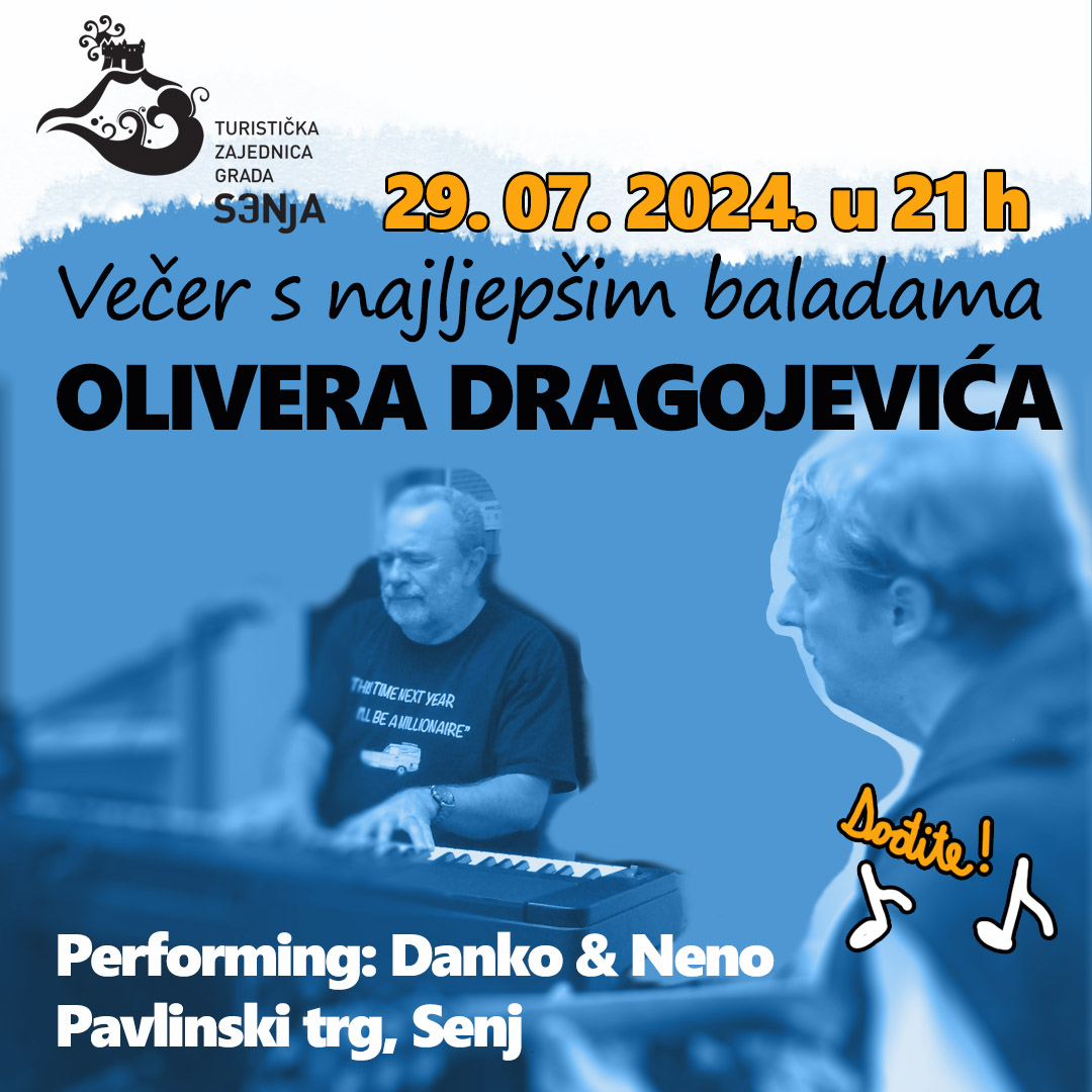 Pozivamo Vas da nam se dana 29.07.2024.g. s početkom u 21 sat pridružite na Pavlinskom trgu u Senju na glazbenoj večeri posvećenoj sjećanju na Olivera Dragojevića. Na dan obilježavanja smrti ovog neponovljivog i jedinstvenog hrvatskog glazbenika njegove najljepše balade izvest će Nenad Petković i Danko Butorac.