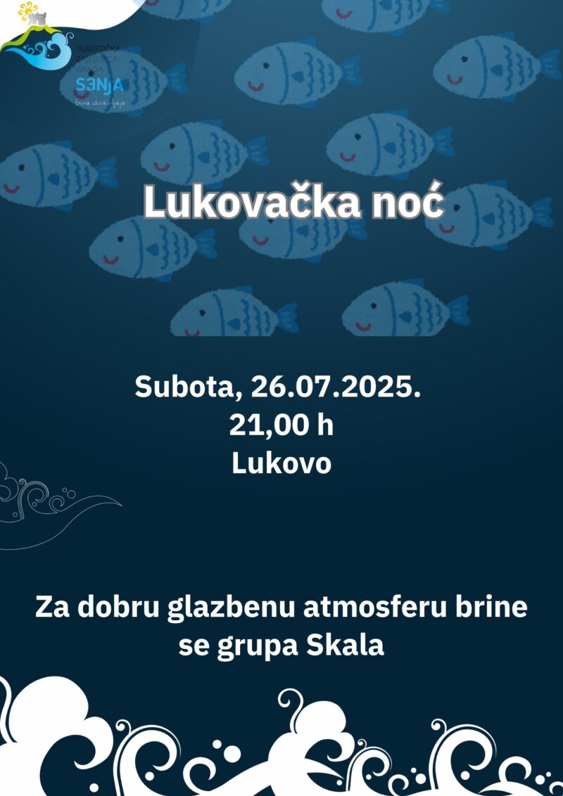 Dana 26. srpnja 2025.g. u Lukovu će se s početkom u 21 sat održati ribarska fešta. Pozivamo vas da posjetite Lukovo i uživate u morskim delicijama i veselom glazbenom ugođaju za koji će se pobrinuti Grupa Skala!