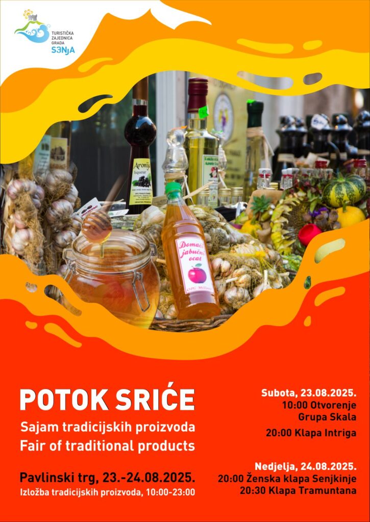 Turistička zajednica grada Senja organizira 23. i 24. kolovoza 2025. g. sajam tradicijskih proizvoda “Potok sriće”. Sajam će biti otvoren svakodnevno od 10:00 do 23:00, a na njemu će se predstaviti izlagači tradicijskih proizvoda iz različitih krajeva Hrvatske. U glazbenom dijelu programa nastupit će Grupa Skala, Klapa Intriga, Ženska klapa Senjkinje i Klapa Tramuntana.