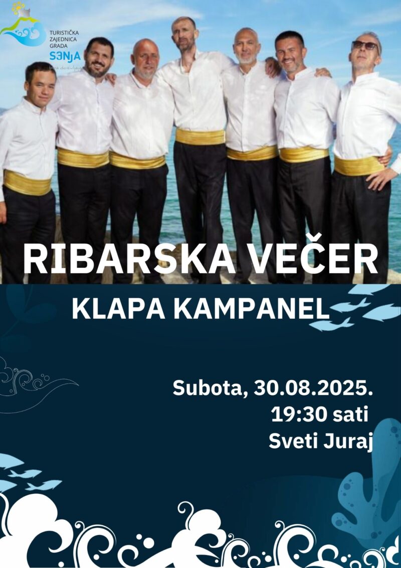 Turistička zajednica Grada Senja organizira u subotu 30.08.2025.g. ribarsku večer koja će se održati u Svetom Jurju s početkom u 19:30 sati. U ugodnom ambijentu uz klapsku pjesmu za sve posjetitelje pripremamo veliku buzaru od dagnji, a u ponudi će biti i ostala riblja jela. Uz mirise i okuse Mediterana večer će obogatiti koncert klape Kampanel.
