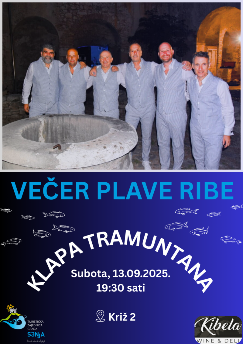 Turistička zajednica Grada Senja u suradnji s Wine Barom Kibela poziva vas na Večer plave ribe koja će se održati 13. rujna 2025.g. s početkom u 19:30 sati na adresi Ulica Križ 2, Senj. Posjetitelji će imati priliku uživati u finger food zalogajima od tradicionalno pripremljene plave ribe, vrhunskim vinima i klapskoj pjesmi za koju će se pobrinuti Klapa Tramuntana.