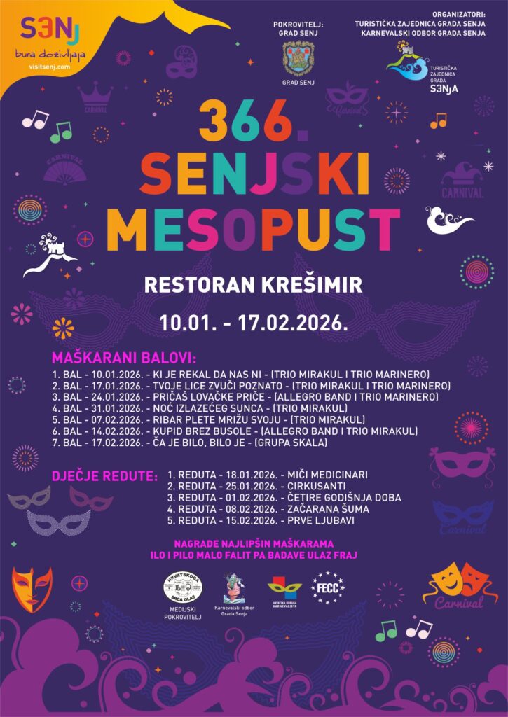 Grad Senj, Turistička zajednica grada Senja i Karnevalski odbor grada Senja pozivaju Vas na 366. Senjski mesopust koji će se održati u periodu od 10.01. do 17.02.2026. godine u restoranu Krešimir.