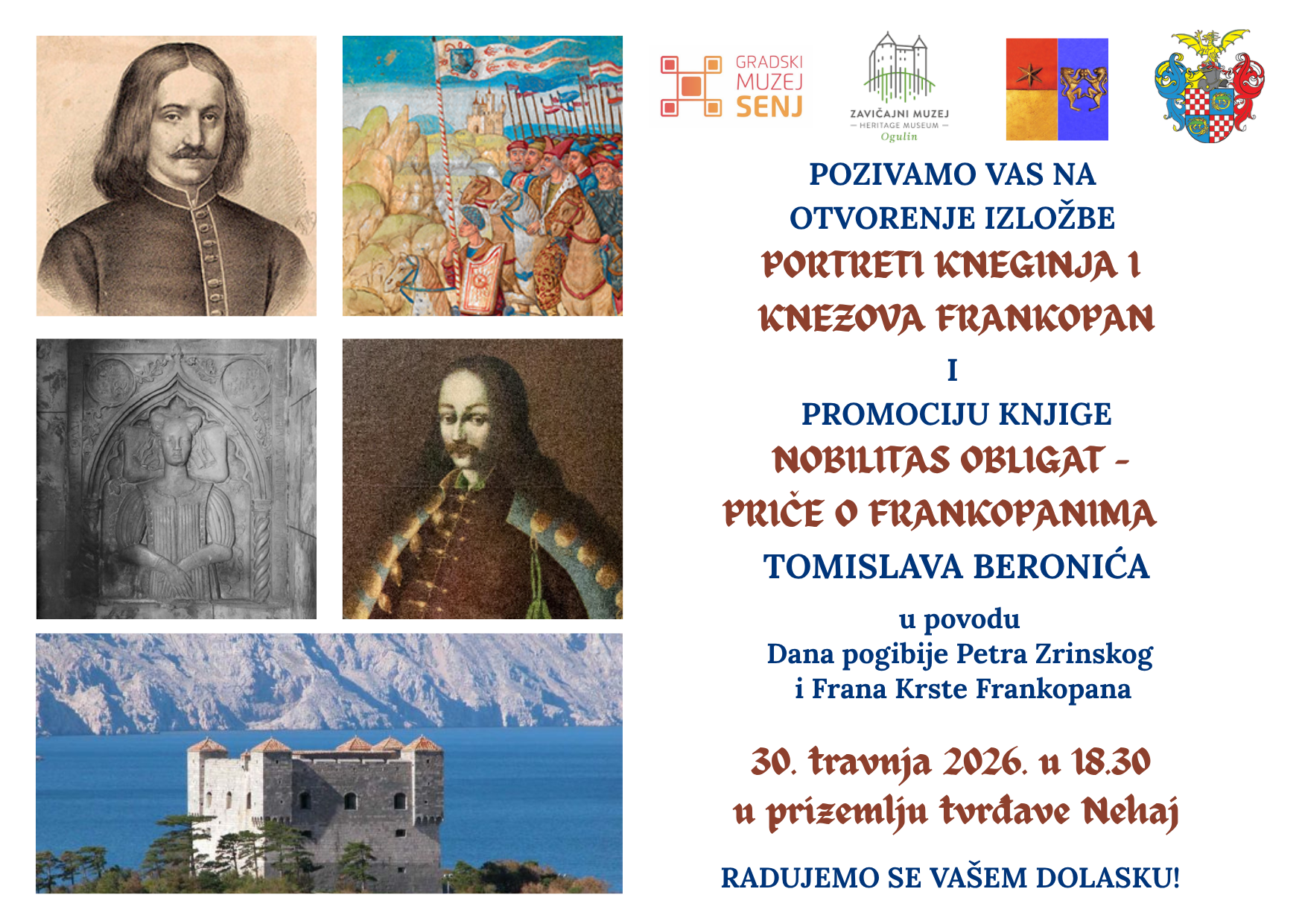 Gradski muzej Senj srdačano Vas poziva na otvorenje izložbe Portreti kneginja i knezova Frankopan, koja će se održati 30. travnja 2026. u 18.30 u prizemlju tvrđave Nehaj u Senju, Nehajski put 3, u povodu obilježavanja Dana pogibije Petra Zrinskog i Frana Krste Frankopana. Gostovanje u Senju organiziraju Gradski muzej Senj, Zavičajni muzej Ogulin, Družba čuvara baštine “Frankopani” i Družba “Braća Hrvatskog Zmaja”.